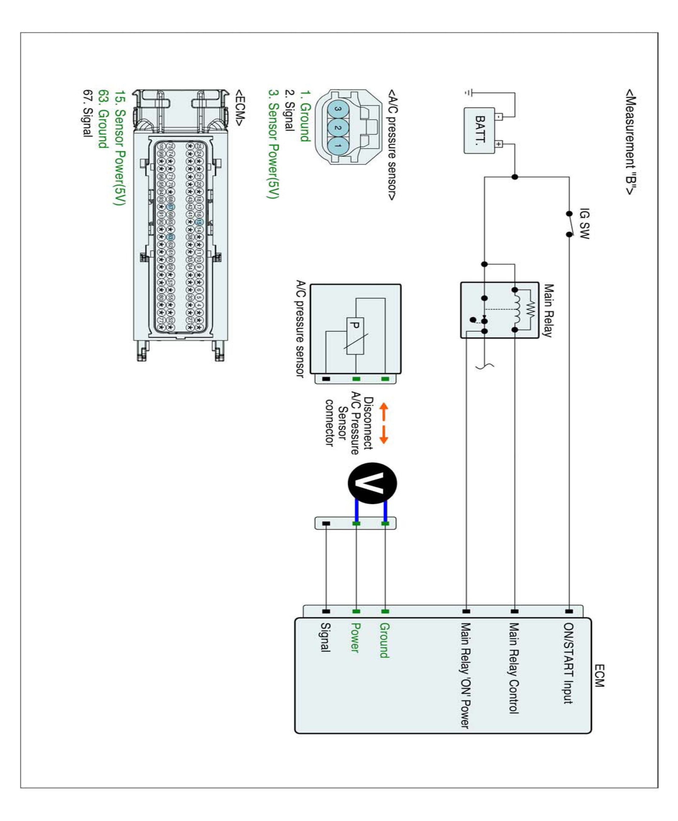 4. Measure the voltage between power and ground terminals of A/C pressure sensor harness connector. (Measurement "B")