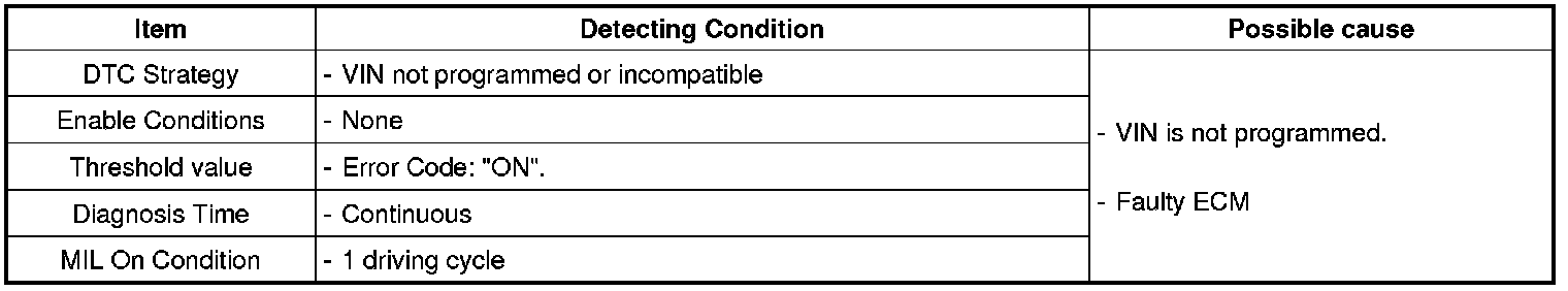 The purpose of this logic is to prevent a vehicle from leaving the assembly plant or service station without a VIN in its EEPROM memory. If the VIN writing is not programmed or incompatible, the ECM determines that a fault exists and a DTC is stored. And the MIL (Malfunction Indication Lamp) turns on.