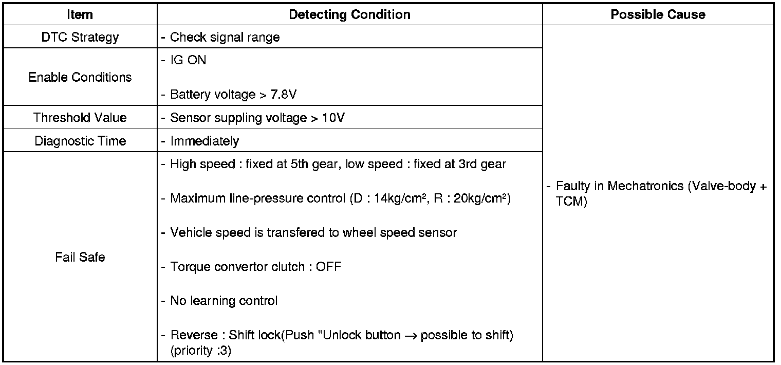 TCM set this code If supplied voltage form TCM is too high.(MIL ON : 2 driving Cycle)