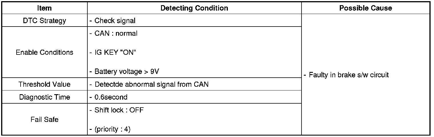 TCM set this code If CAN signal normal condition and Brake s/w output abnormal signal to TCM. (MIL OFF)