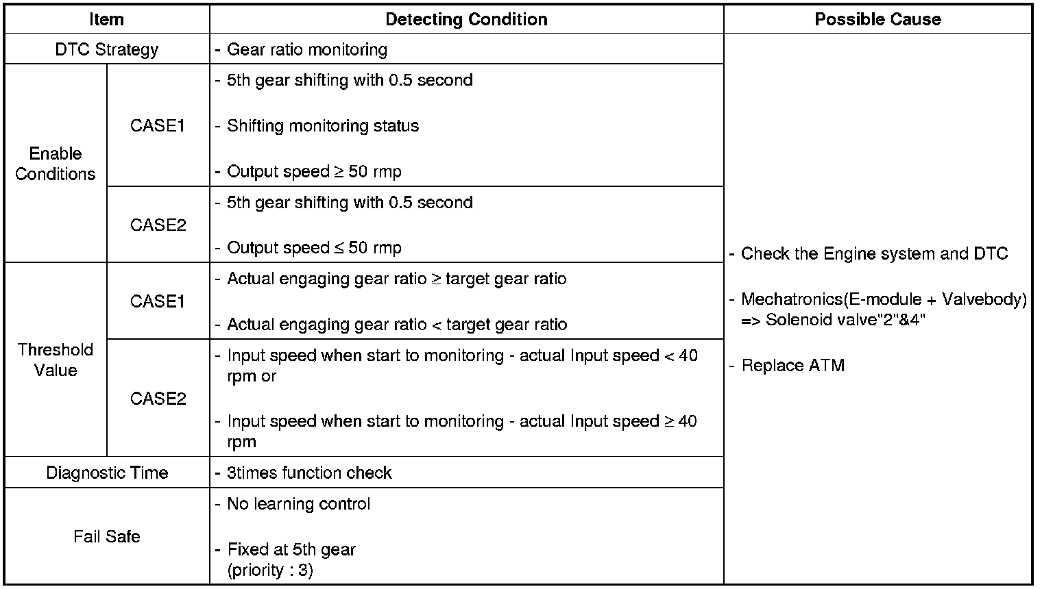 TCM set this code if the value of input speed (turbine speed) is not equal to the value of the output speed, when multiplied by the 5th gear ratio, while the transaxle is engaged in 5th gear. If this code outputted, Check the Engine system first and then follow this procedure. (MIL ON : 2 driving Cycle)
