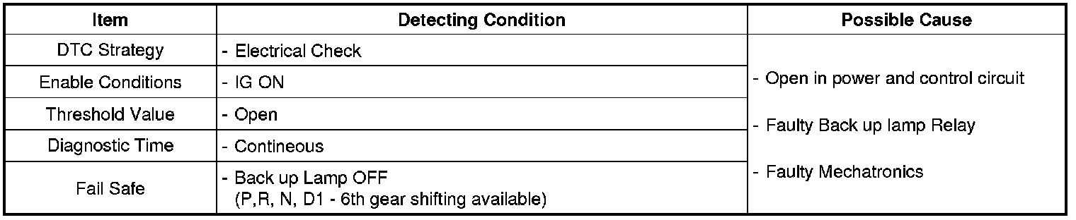 Back-up lamp relay is installed on the junction box in the engine room. It is a relay to control the back up lamp ON / OFF. When driver shifts to Reverse, TCM sends 12 V to coil and ground this signal to control back-up lamp relay.