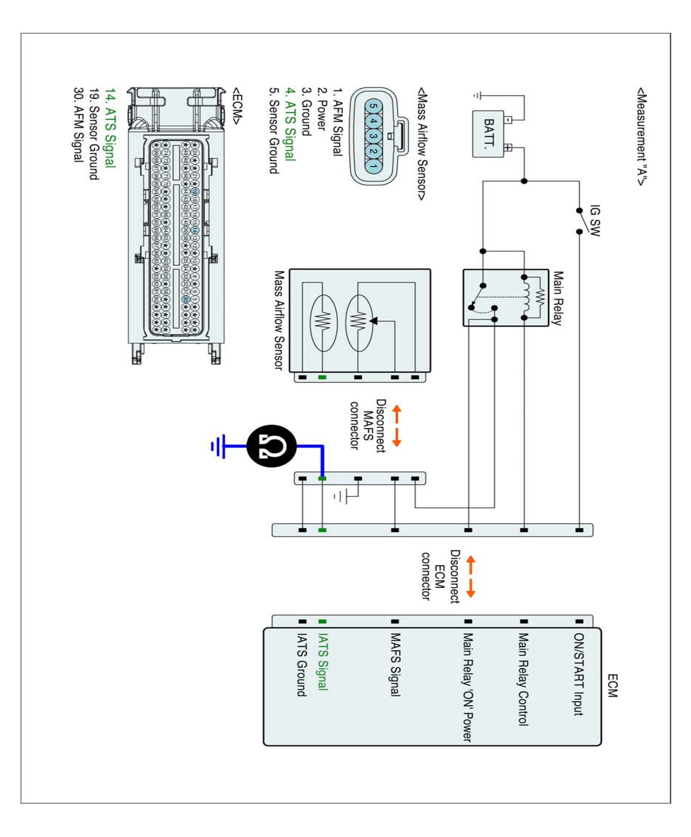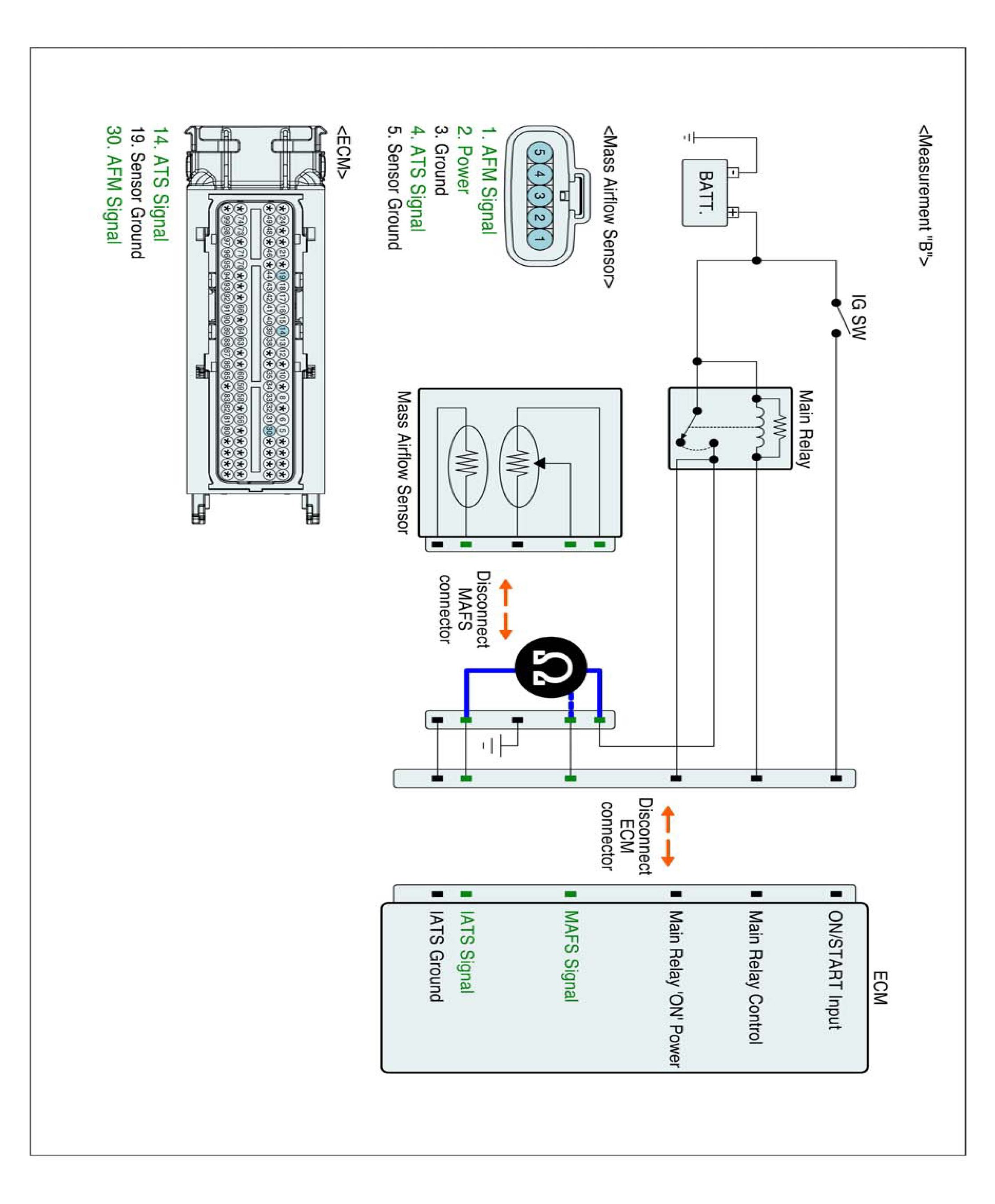 4. Measure resistance between signal terminal of IATS harness connector and ground terminal of MAFS harness connector. (Measurement "B")