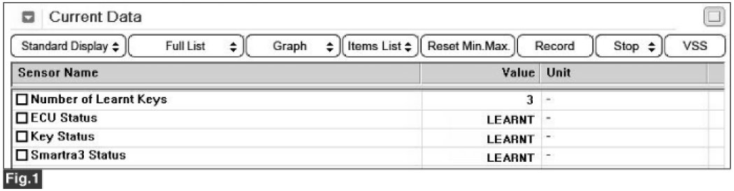 Fig.1) This data show that 3 keys have been taught, ECU has been learnt, Key in key cylinder has been learnt and SMARTRA 3 has been learnt.