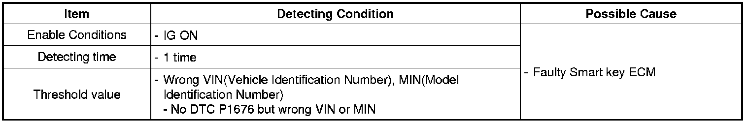 During the Immobilizer authentication, If there is any wrong VIN (Vehicle Identification Number) or MIN (Model Identification Number) signal on the communication message, ECM sets DTC P1696.
