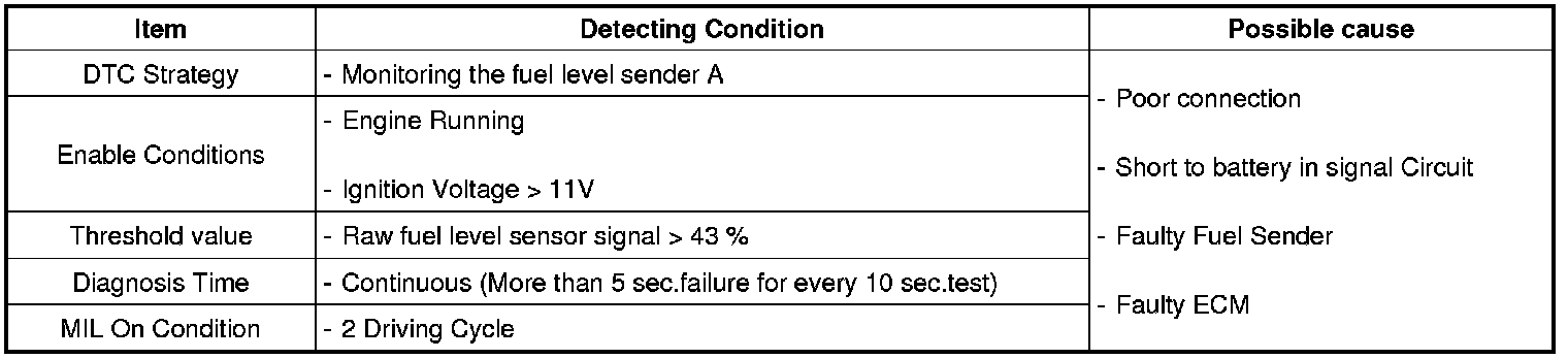 Checking output signals of fuel level sender under detecting condition, if the fuel level is too high, ECM sets P2068. MIL (Malfunction Indication Lamp) turns on when the malfunction lasts till consecutive 2 driving cycle.