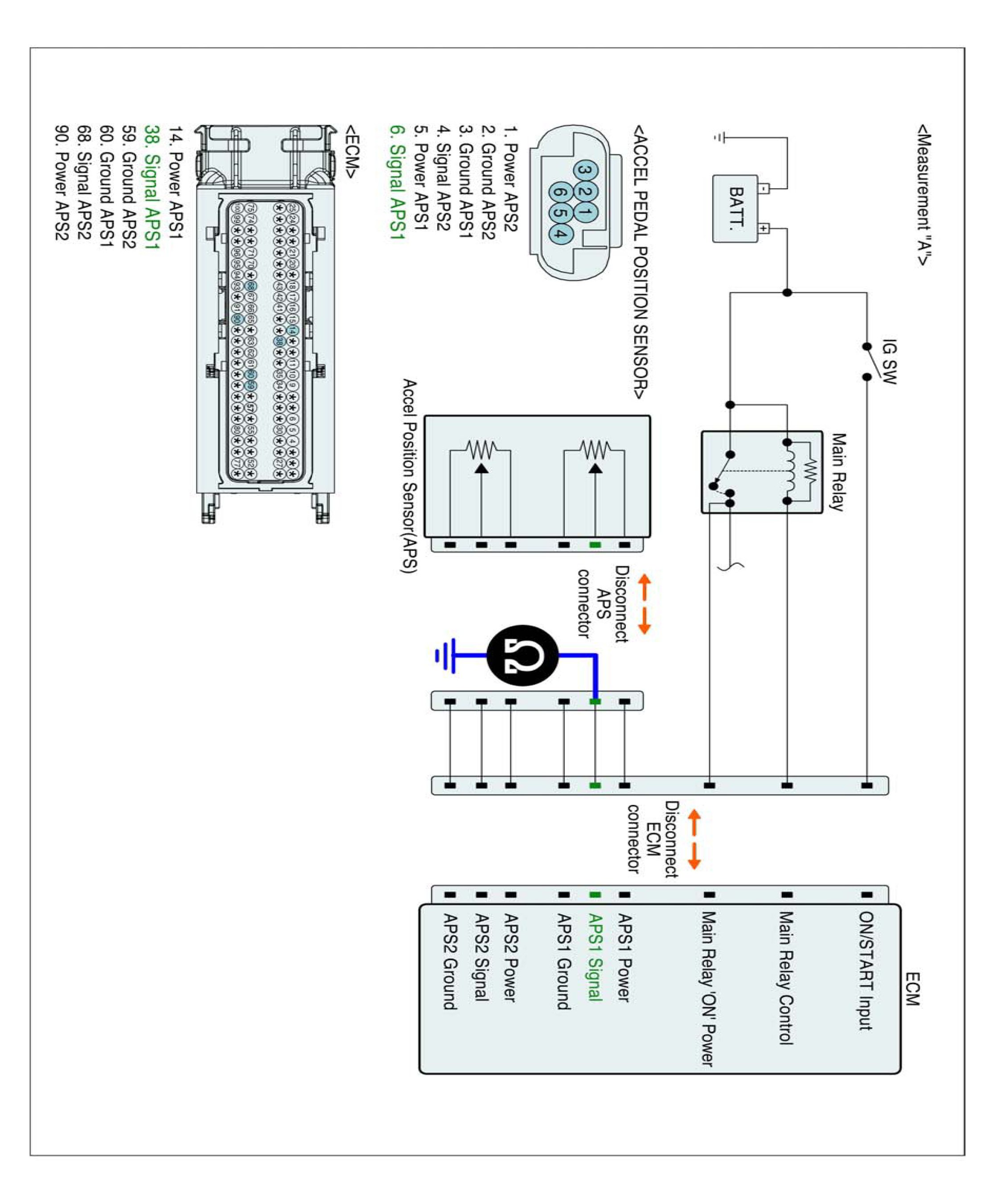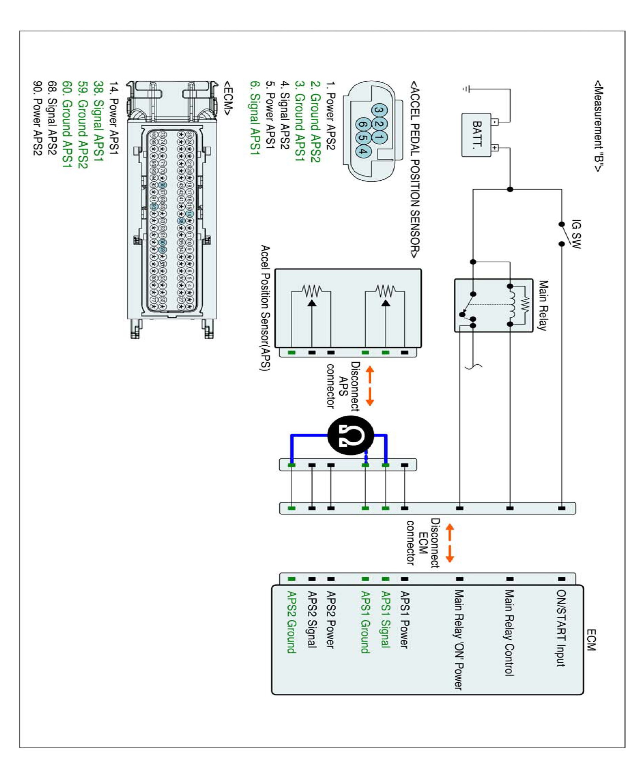4. Measure resistance between APS 1 signal and APS 1 (2) ground terminals of APS harness connector. (Measurement "B")