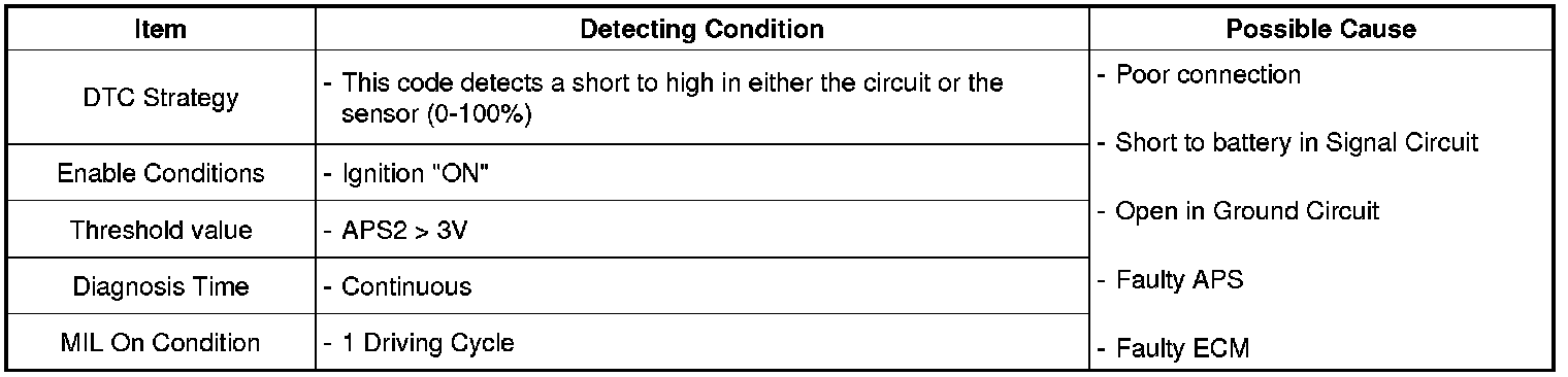 Checking output signals from APS 2 under detecting condition, if output signals are above the threshold, ECM sets P2128. And then MIL (Malfunction Indication Lamp) turns on.