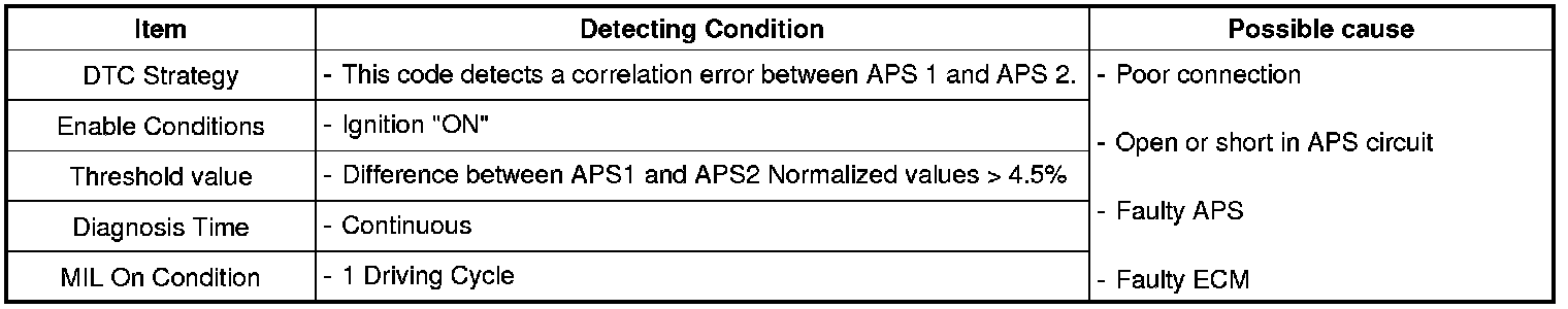 Checking output signals from APS 1 and 2 under detecting condition, if output signals difference between APS 1 and 2 are detected more than 4.5% for the specified number of times., ECM sets P2138. And then MIL (Malfunction Indication Lamp) turns on.
