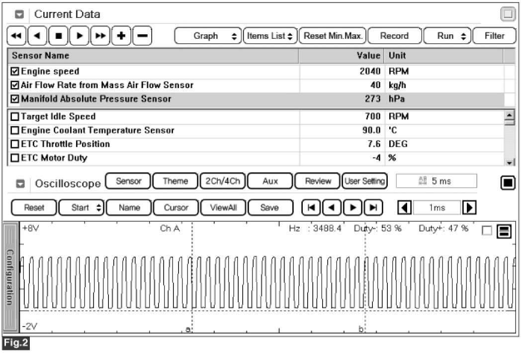 Specification :Signal waveform will be displayed as follows. Frequency will be increased during acceleration. (Be aware that the signal of MAFS is not voltage display but frequency display.)