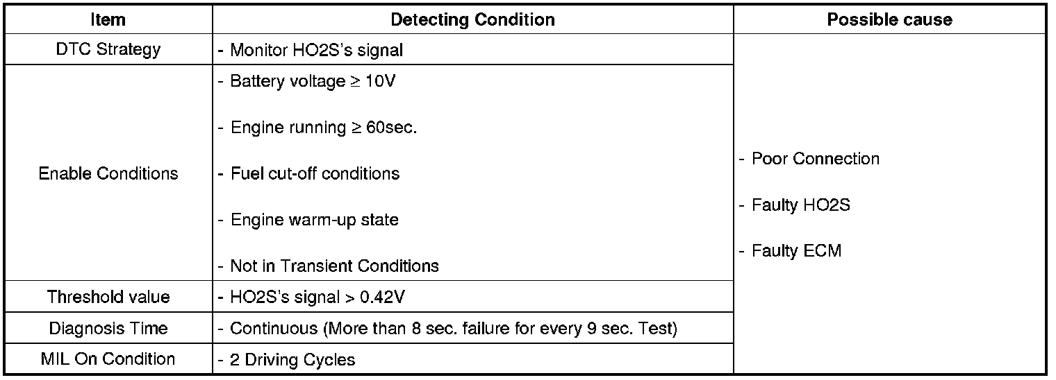 Checking output signals from HO2S under detecting condition, if HO2S's signal is rich during fuel cut-off conditions, ECM sets P2196. MIL (Malfunction Indication Lamp) turns on when the malfunction lasts till consecutive 2 driving cycles.