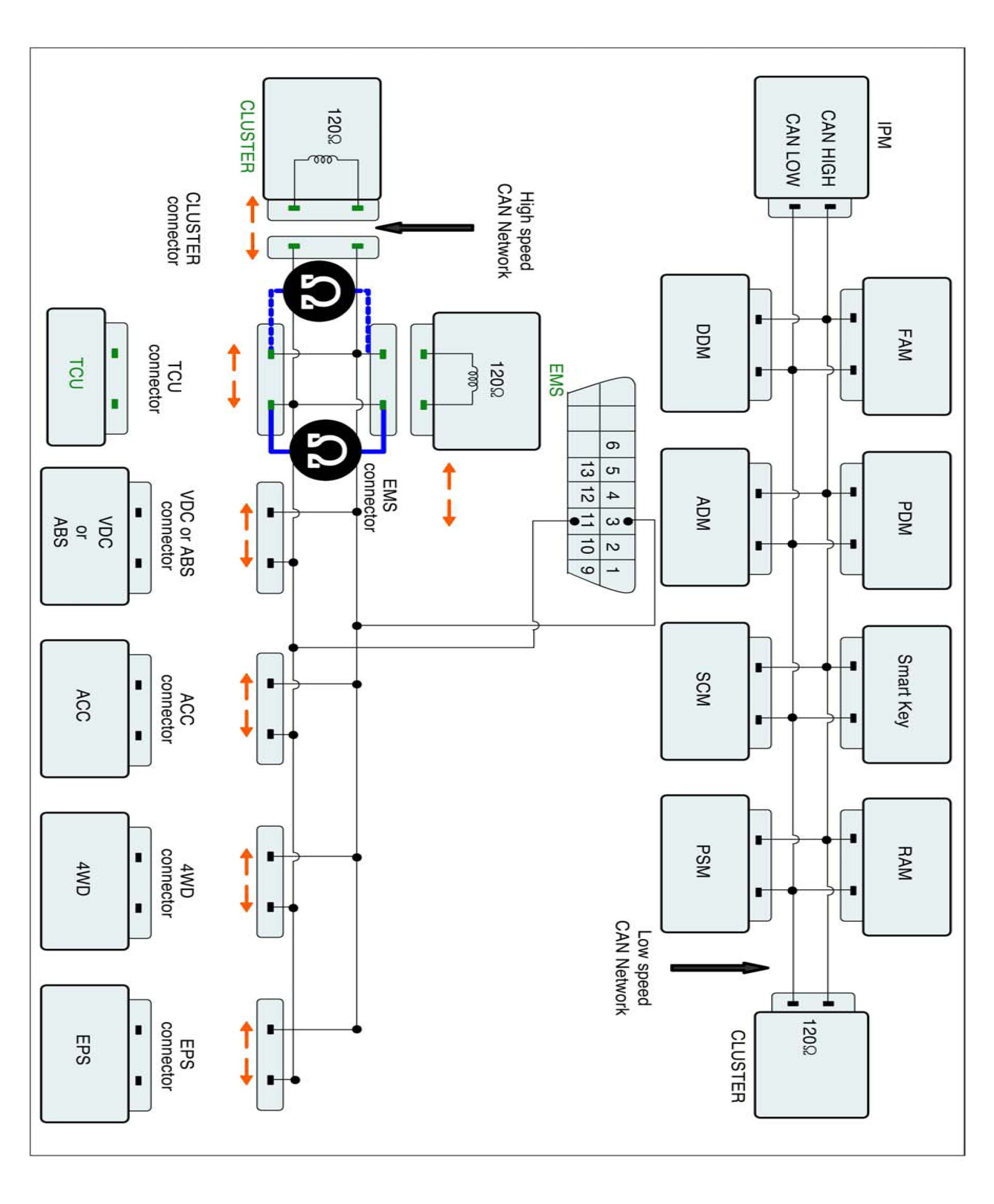 3. Measure resistance between TCM CAN HIGH or CAN LOW and CLUSTER CAN HIGH or CAN LOW terminal.