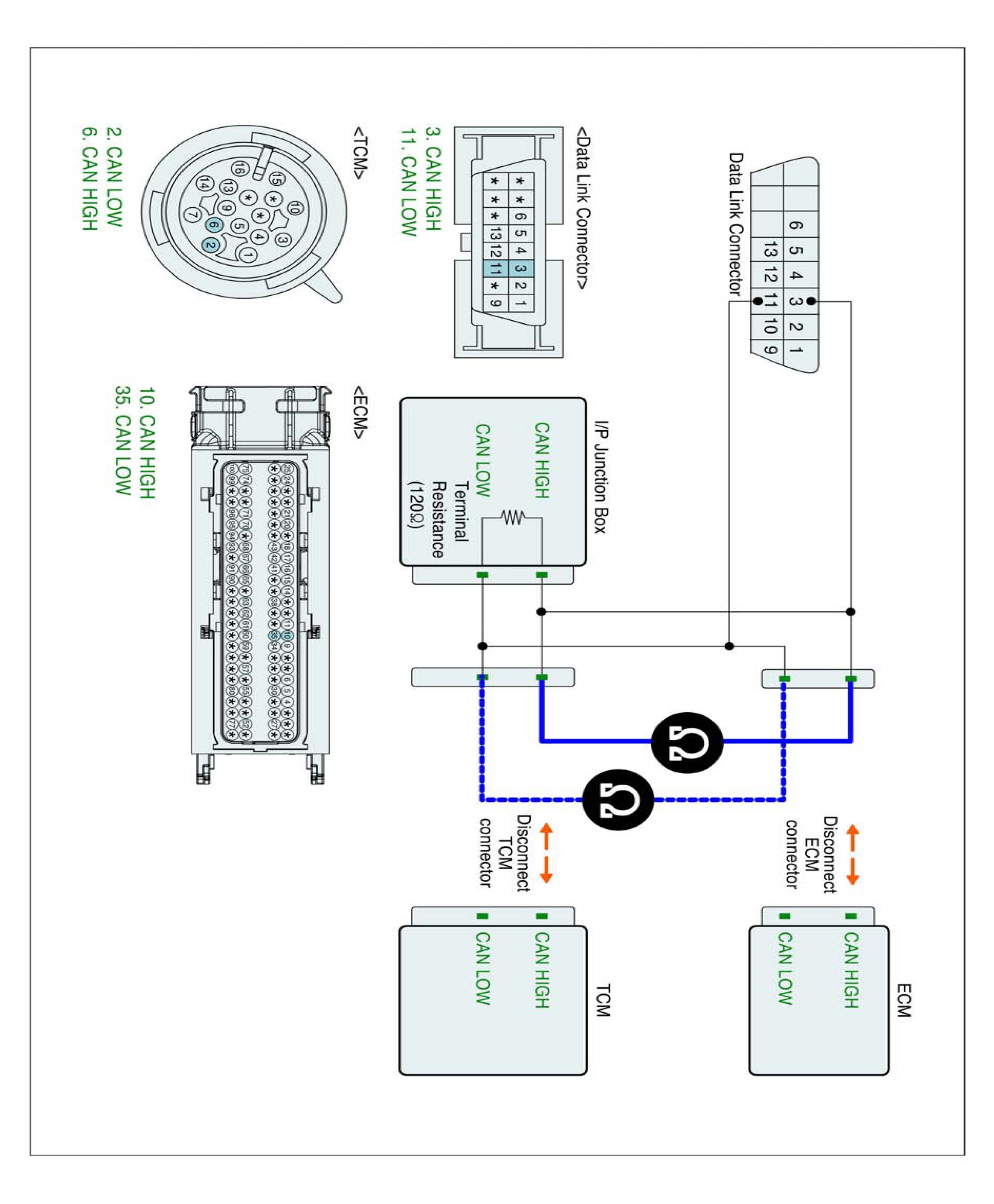 3. Check resistance between CAN-LOW terminal of ECM harness Connector and CAN-LOW terminal of TCM harness connector.