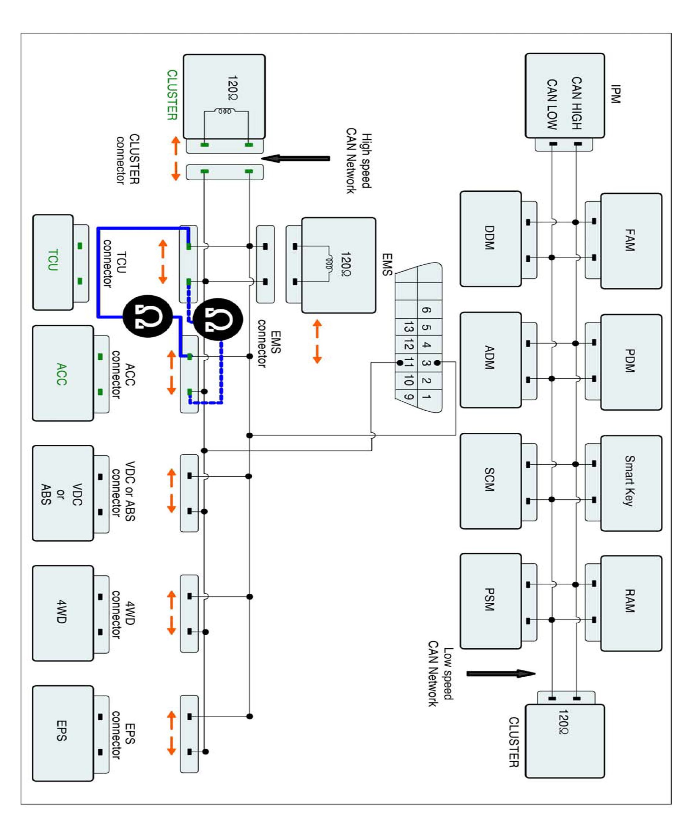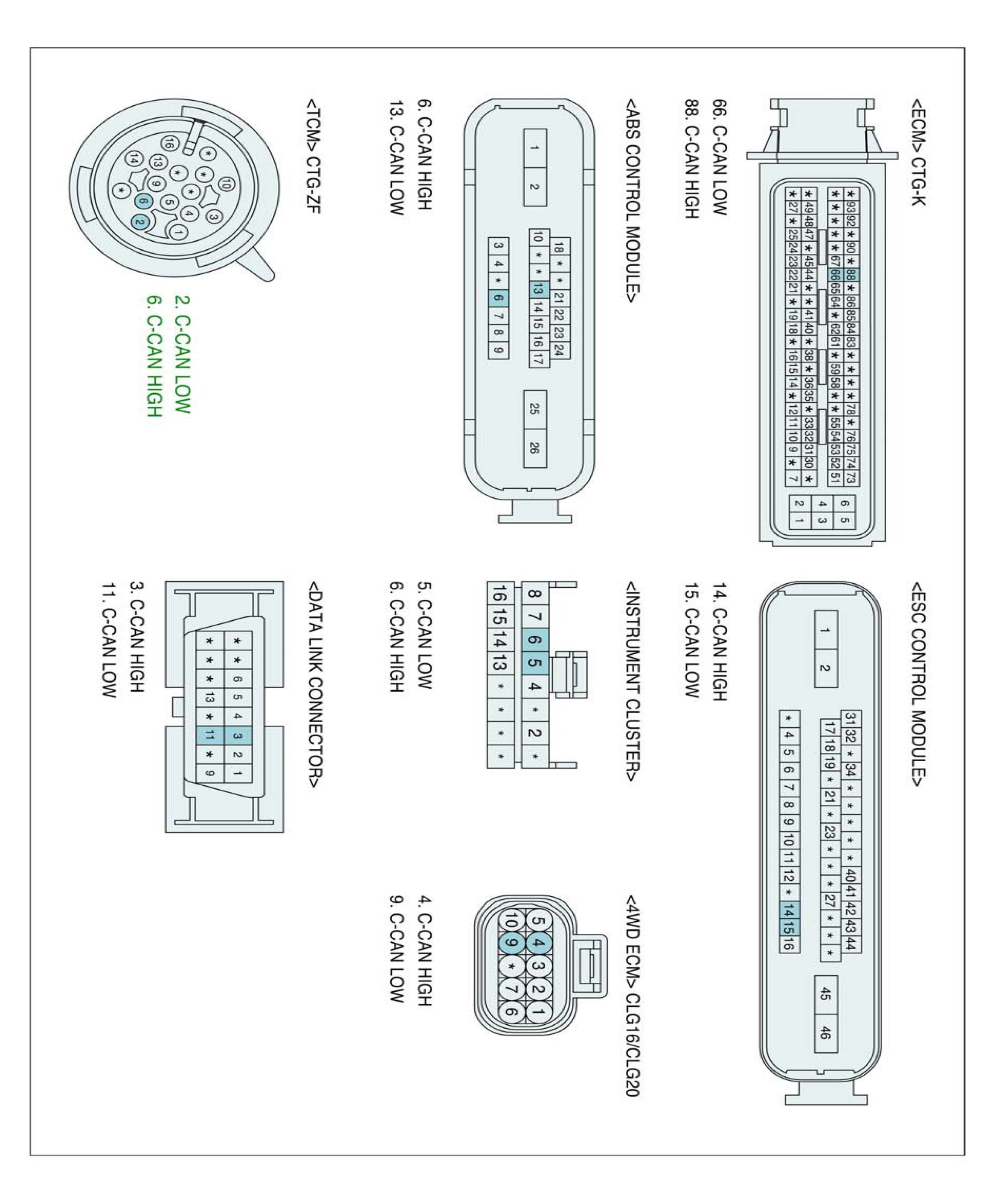 3. Measure resistance between TCM CAN HIGH or CAN LOW and CLUSTER CAN HIGH or CAN LOW terminal.