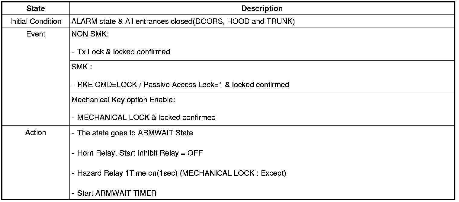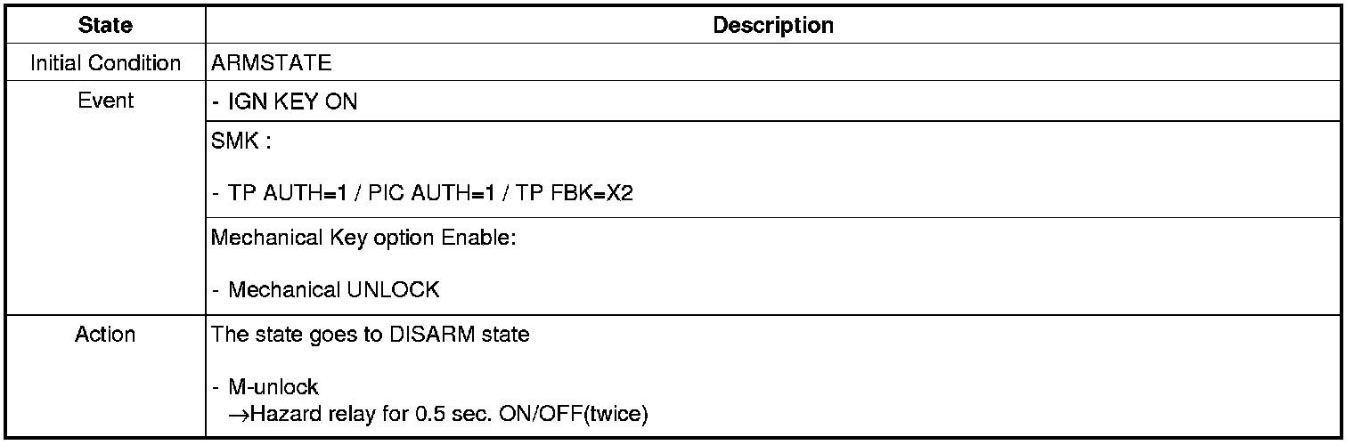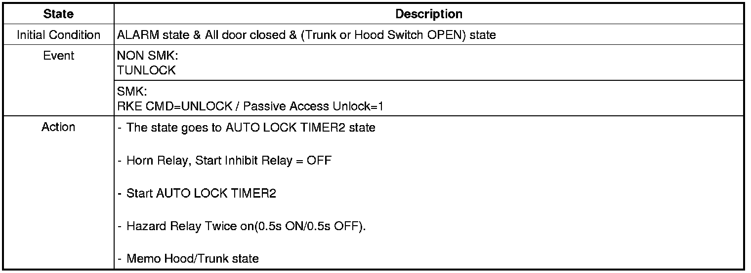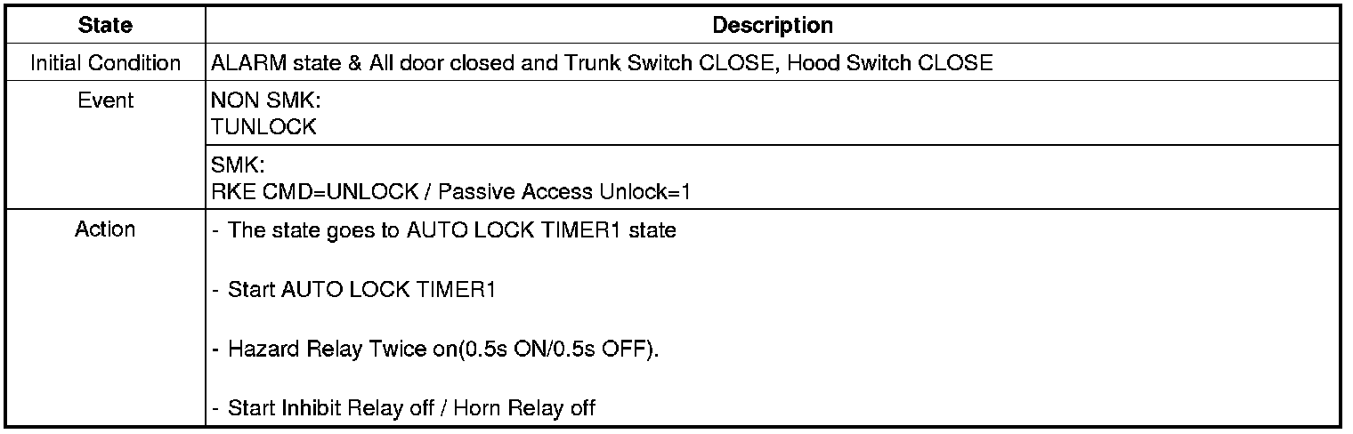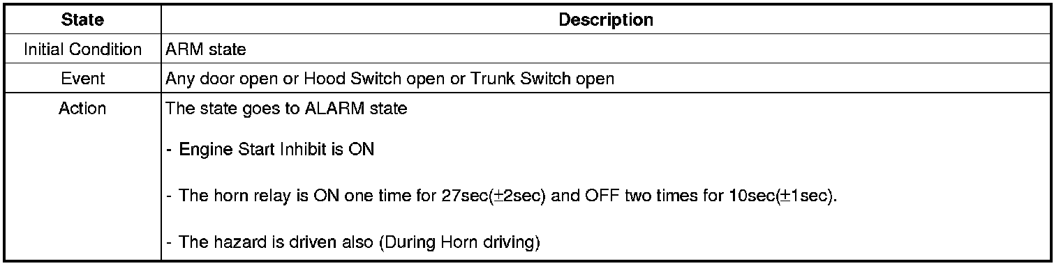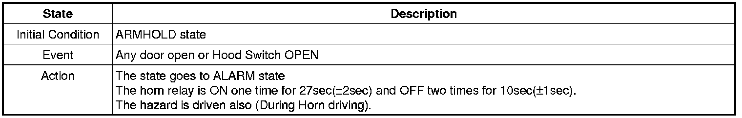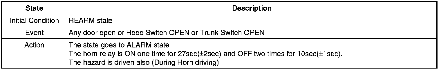 When the system is set off, the alarm (horn) sounds and the hazard lamp flash for about two minutes or until the system is disarmed by unlocking the transmitter.