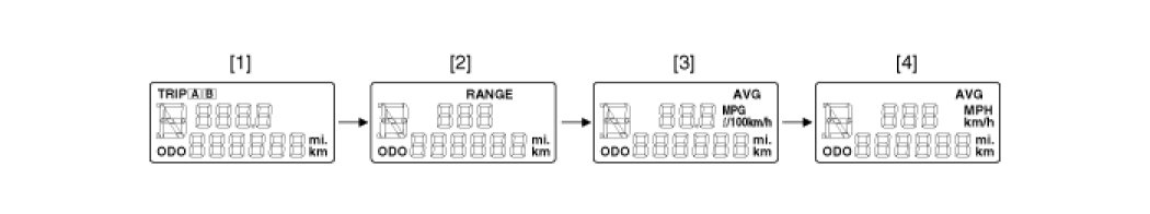 When there is no pulse signal on vehicle speed after reconnecting the battery or resetting the data, "---L/100Km (MPG)" symbol will be displayed.