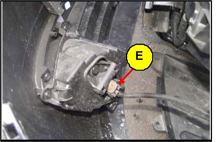 8. Disconnect fog lamp connectors (E) on both sides and remove the front bumper fascia.