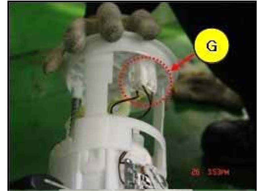 11. Once the fuel pump top plate is detached, remove the fuel filter by releasing the 2 holding hooks. (There is one at "J" and another hook located at the opposite side of "J").