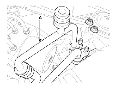 5. Remove 2 bolts, and then remove the condenser (A) by lifting it up. Be careful not to damage the radiator and condenser fins when removing the condenser.