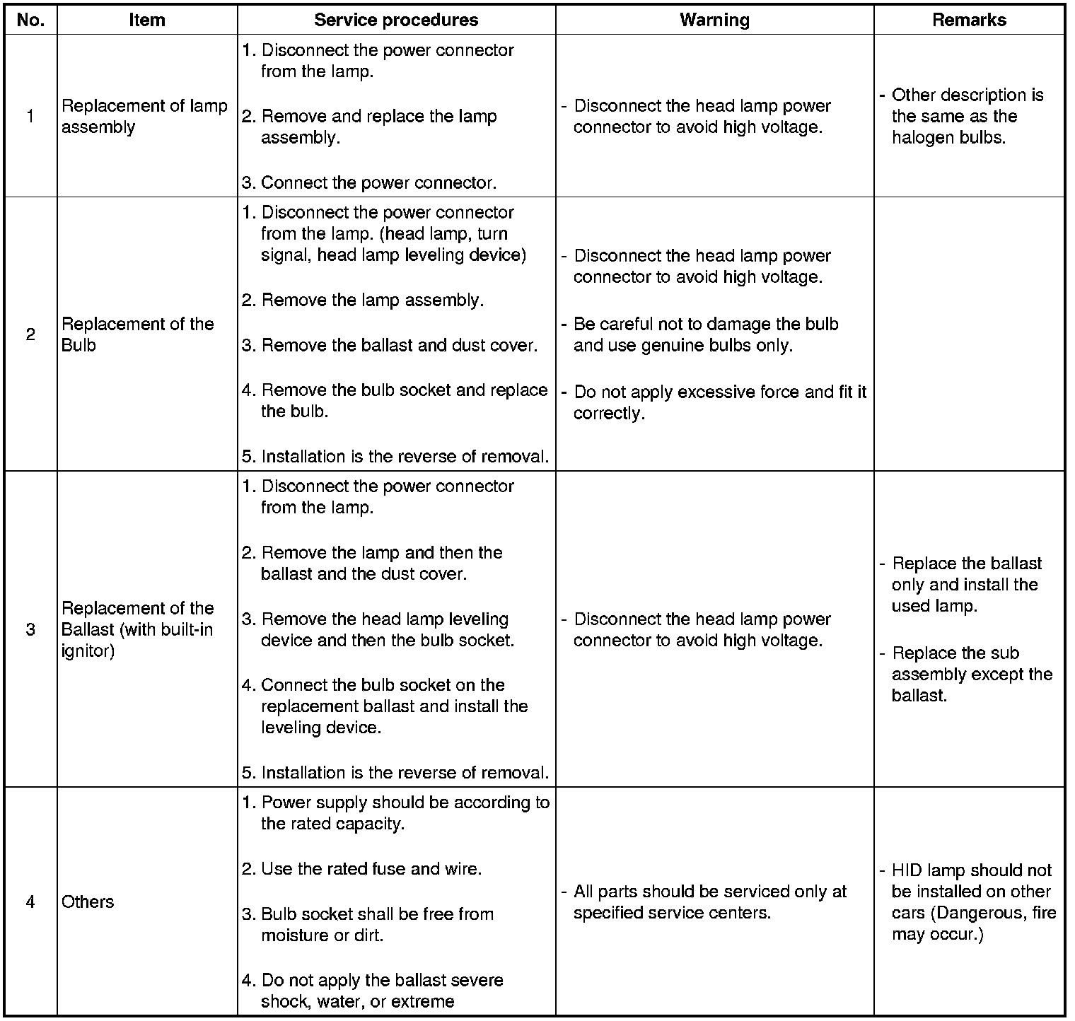 HID lamp shall not be used on other cars.(Fire may occur.)