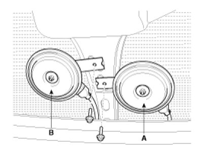 2. Remove the bolt and disconnect the horn connector, then remove the high pitch horn(A) and the low pitch horn(B).