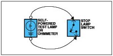 B. Connect one lead of a self-powered test lamp or ohmmeter to one end of the part of the circuit you wish to test. If you are using an ohmmeter, hold the leads together and adjust the ohmmeter to read zero ohms.
