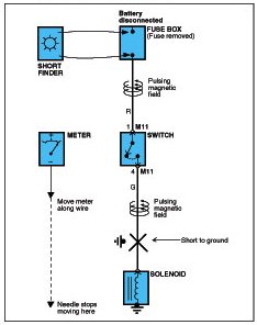 E. Beginning at the fuse box, slowly move the short finder along the circuit wiring. The meter will show current pulses through sheet metal and body trim. As long as the meter is between the fuse and the short, the needle will move with each current pulse. Once the meter is moved past the point of the short, the needle will stop moving. Check around this area to locate the cause of the short circuit.