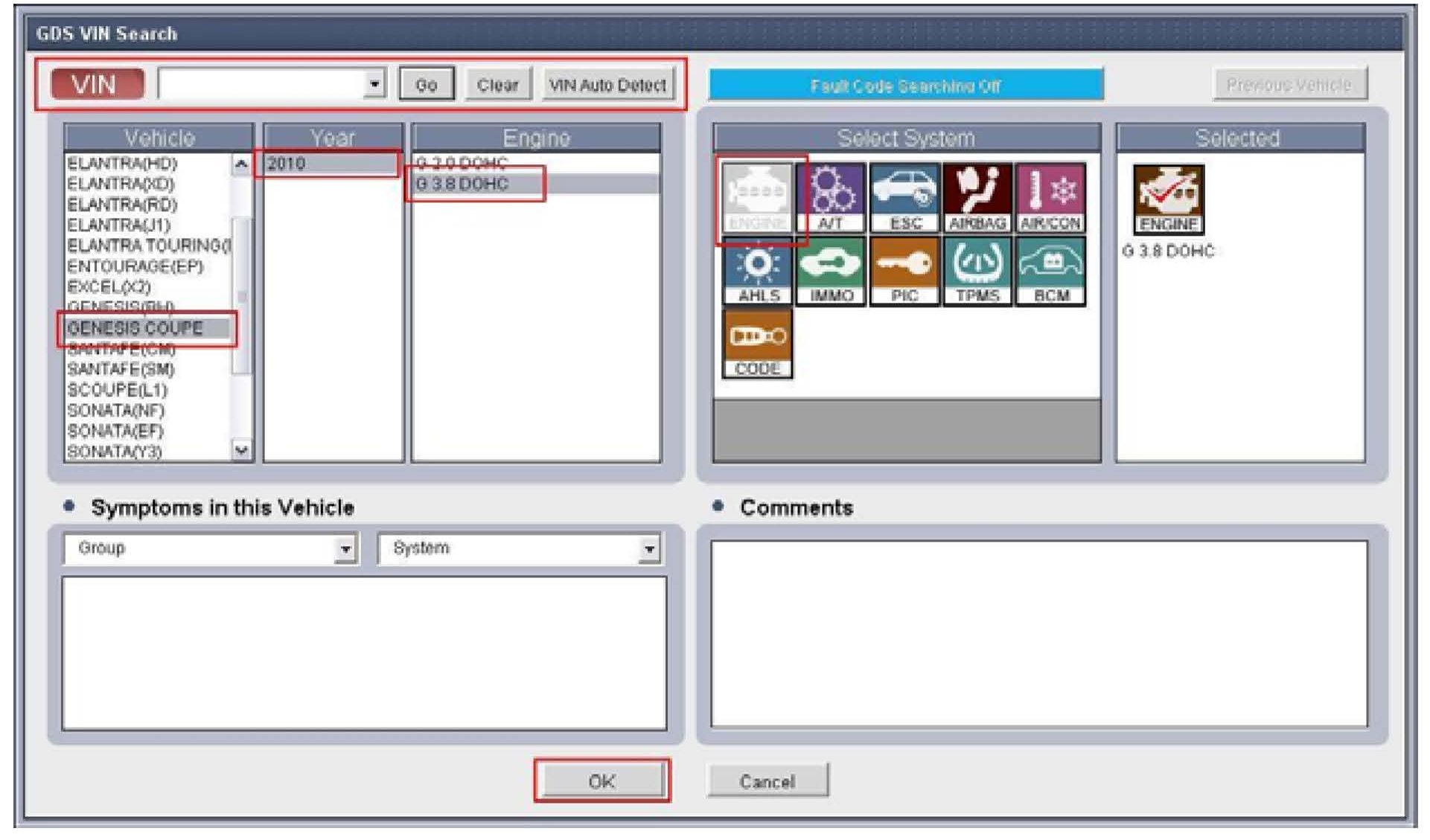 2. Enter the vehicle information by pressing the VIN Auto Detect button, entering the vehicle's VIN or selecting the vehicle model, model year, engine/fuel type and ENGINE as the system and then click OK.