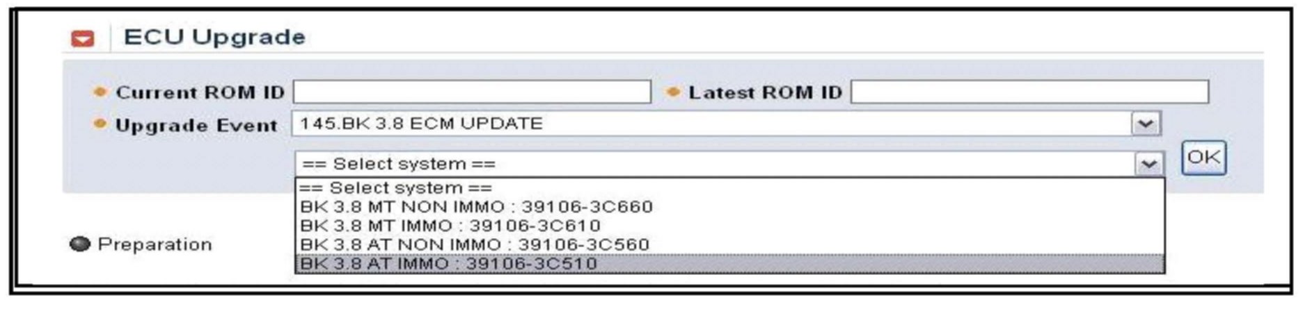 1. Within the ECU Upgrade screen, select Manual Mode in the left column, then select appropriate Upgrade Event. "145.BK 3.8 ECM UPDATE." Select the appropriate control unit part number with reference to the ROM ID Information Table and click OK.
