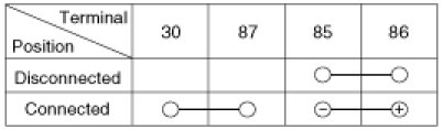 2. There should be continuity between the No.30 and No.87 terminals when power and ground are connected to the No.85 and No.86 terminals.