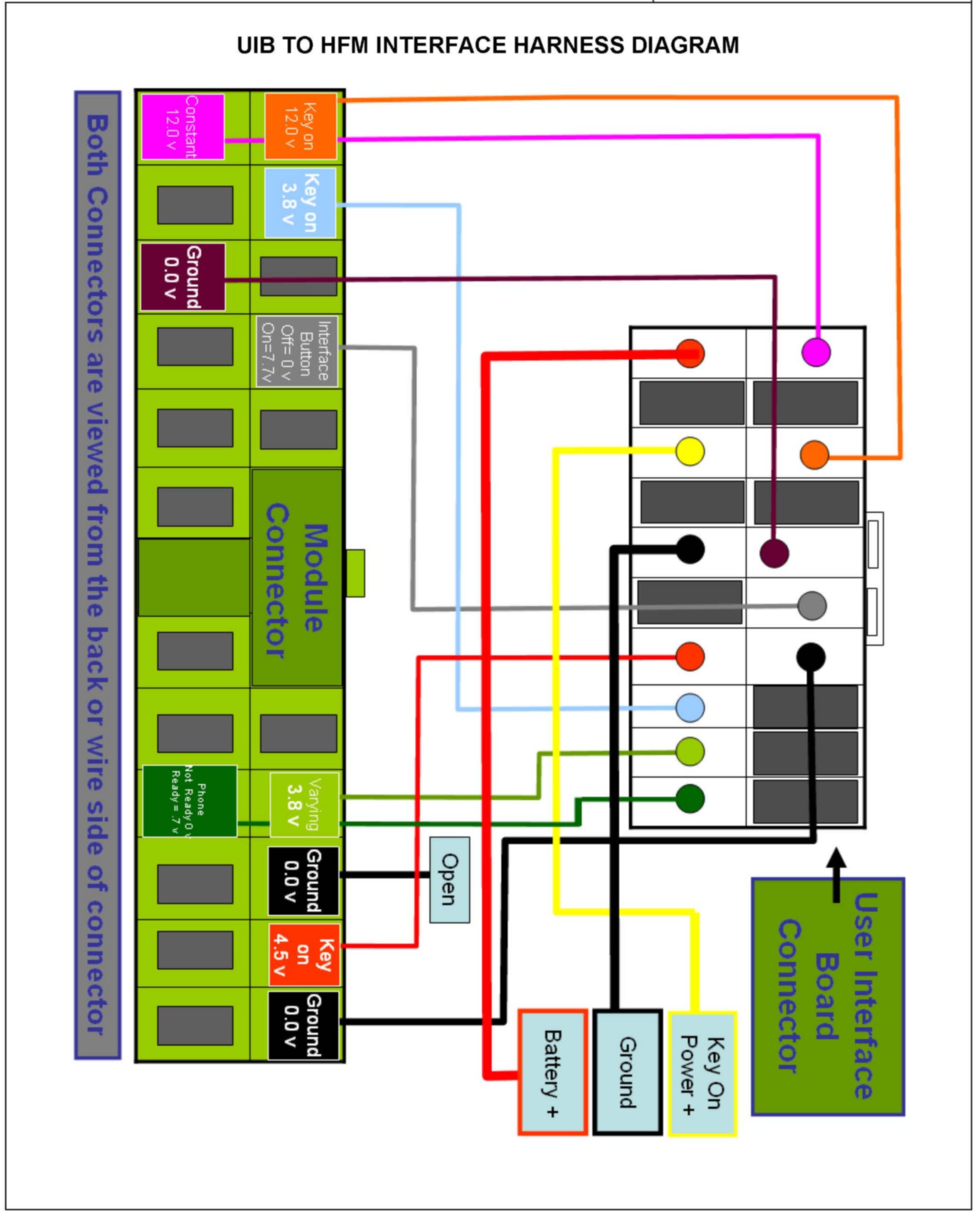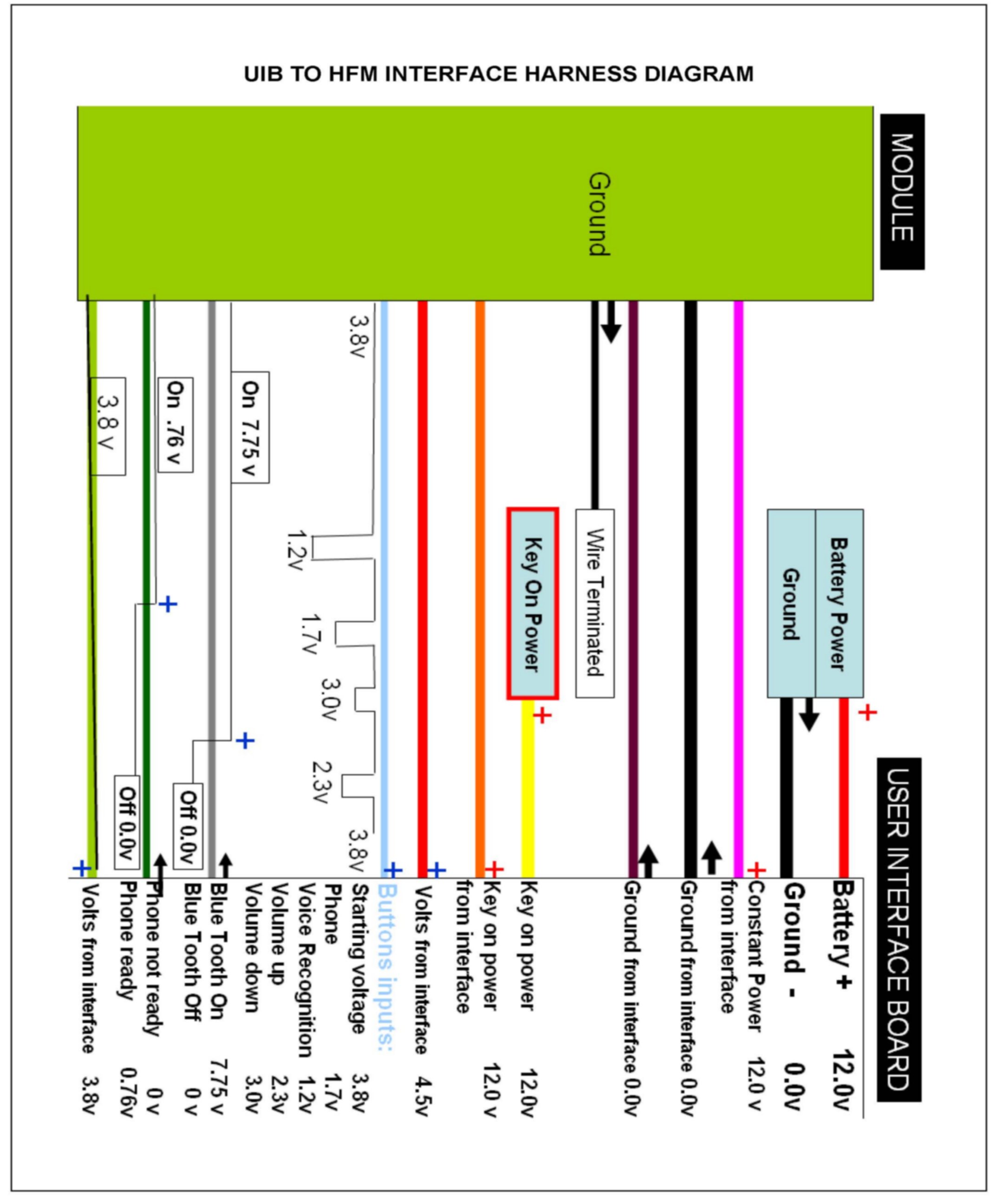 4. Refer to the power harness diagram and circuit-fuse matrix (shown above) to check the BATT, ACC, and GND circuits.