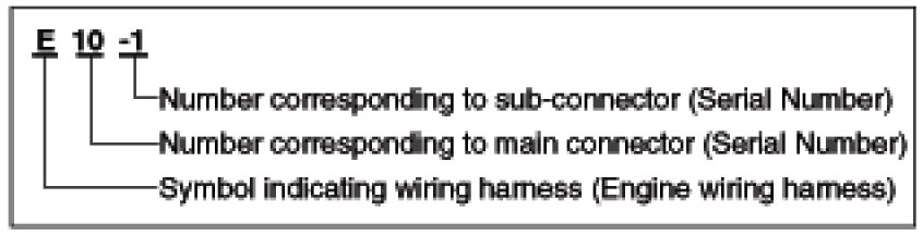 A Connector identification symbol consists of a wiring harness location classification symbol corresponding to a wiring harness location and number corresponding to the connector.