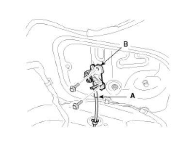 2. Disconnect the inside handle cable (A), then loosen the key holder (B) mounting bolts and remove.