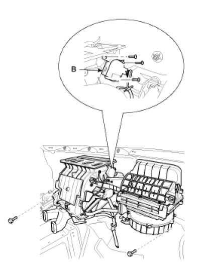 7. Loosen the mounting screws and then remove the console temp control actuator (B).