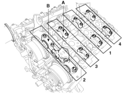 Install the LH/RH camshaft bearing cap (A) and thrust bearing cap (B).