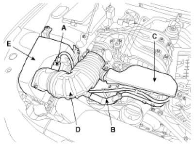 (1) Install the intake air hose (D) and air cleaner assembly (E).
