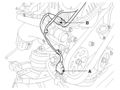(1) Disconnect the power steering oil pressure switch connector(A) and RH knock sensor connector(B).