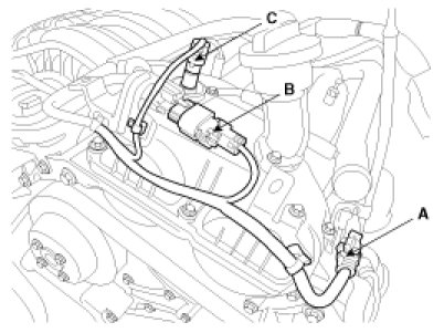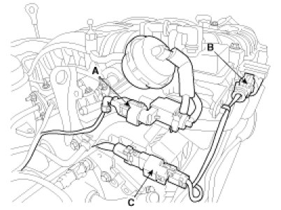 (7) Disconnect the VIS solenoid valve connector (A),PCSV connector (B) and RH oxygen sensor connector (C).