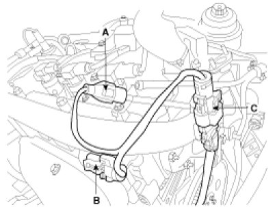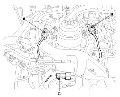 (4) Connect the LH intake camshaft CMP sensor connector (A) ,RH intake camshaft CMP sensor connector (B) and condenser connector (C).