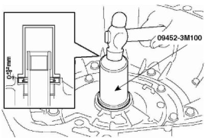 4. service the special service tool(09452-3M300) and a hammer, install the new oil seal to the extension housing assembly.