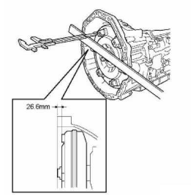 7. Measure the dimension from the end face of the housing to the torque converter assembly as shown in the figure, and check that the torque converter assembly is installed properly.