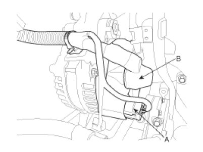 4. Disconnect the alternator connector (A) and cable (B) from the 'B' terminal.