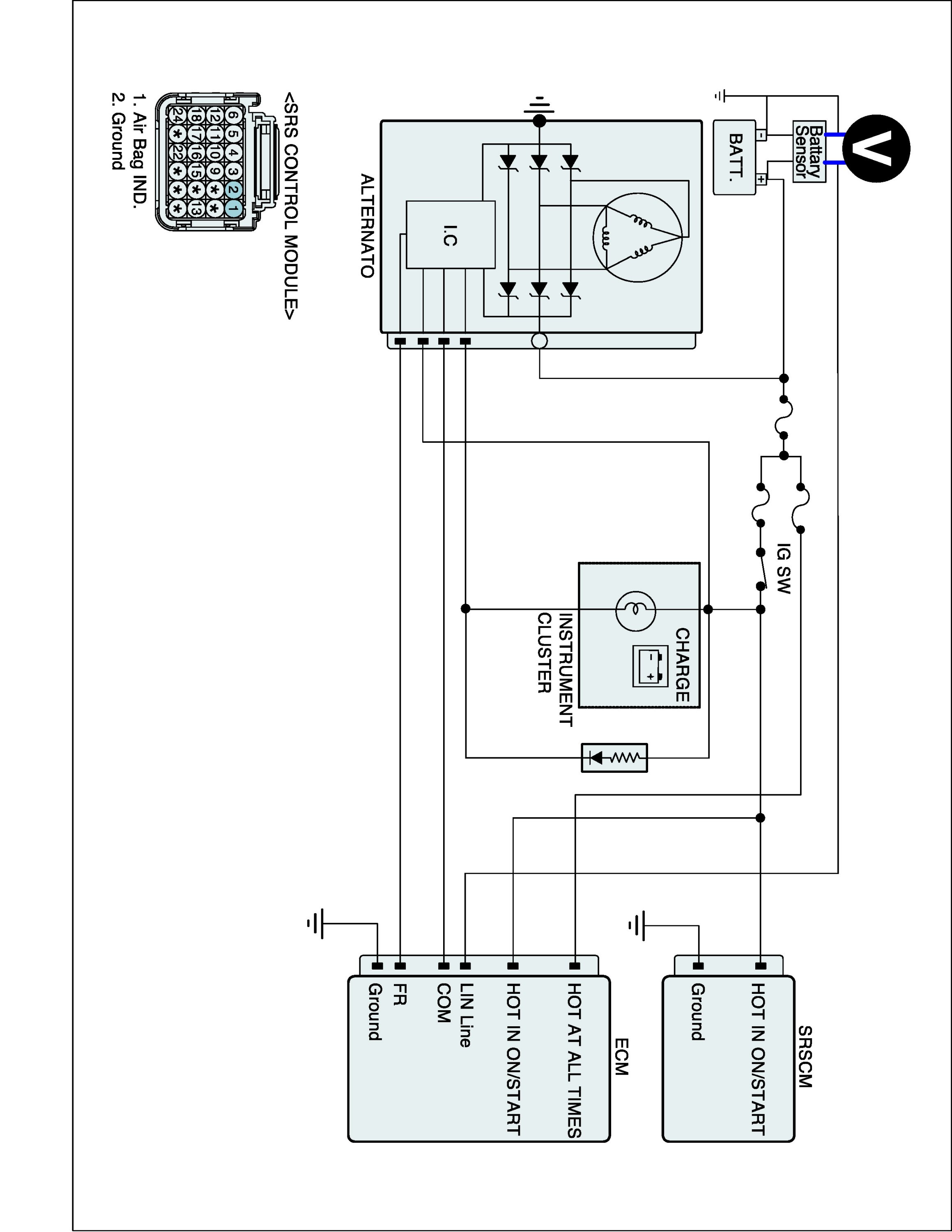 2. Measure voltage between the battery terminal (+) and (-) maintaining ENG. RPM 2,500 RPM (idle) over 2 minutes.