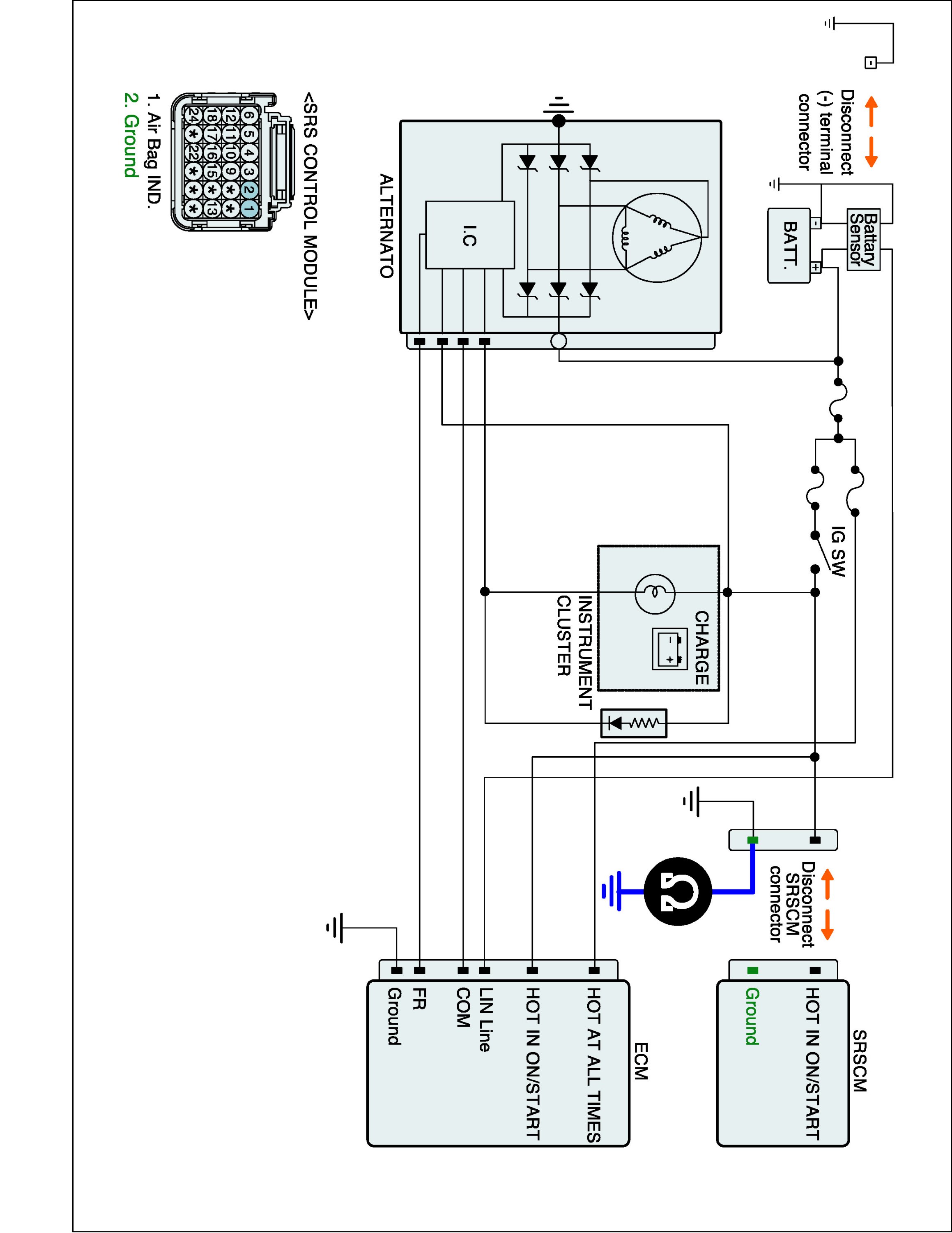 4. Measure resistance between ground terminal of the SRSCM harness connector and chassis ground.