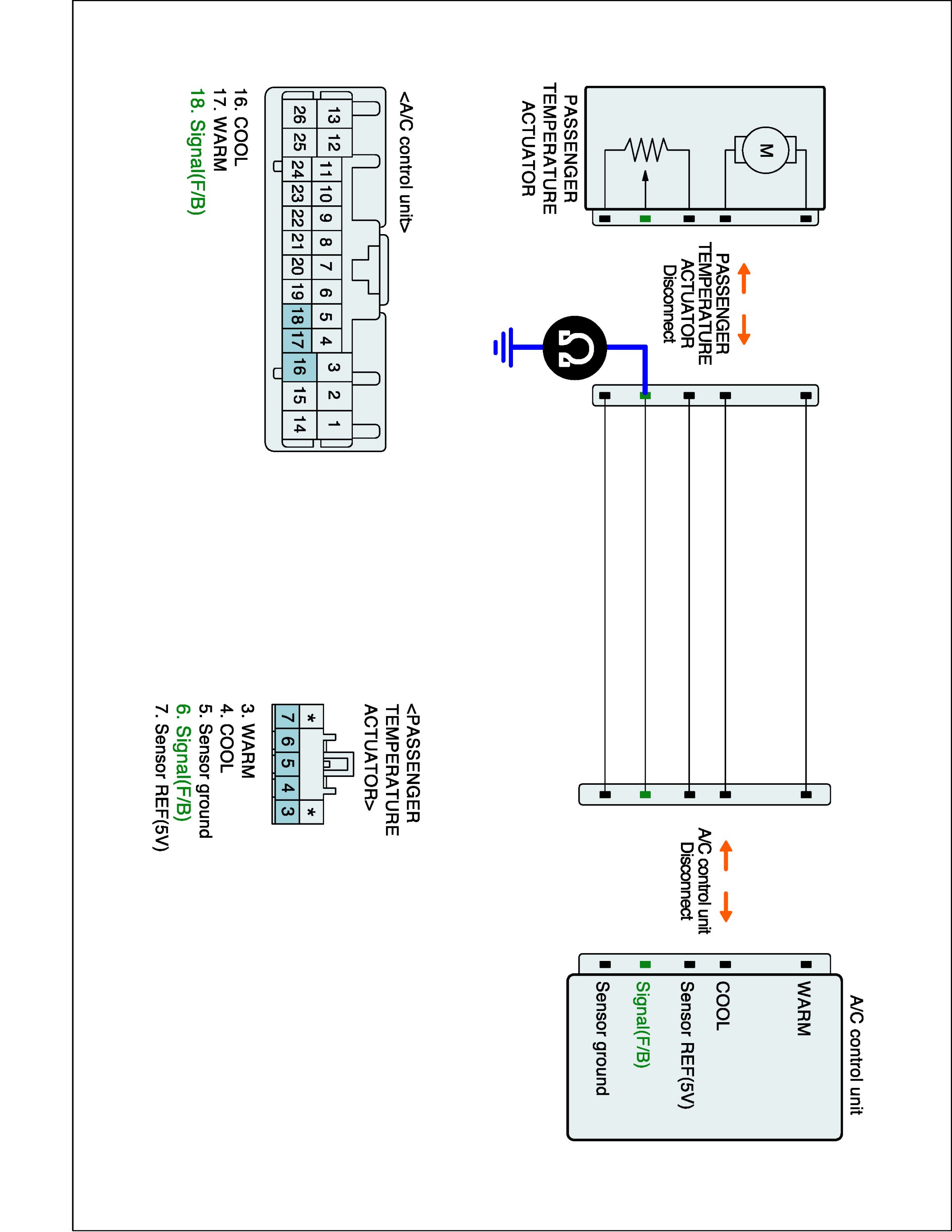3. Measure resistance between Signal (F/B) terminal of passenger air mix actuator harness connector and chassis ground.