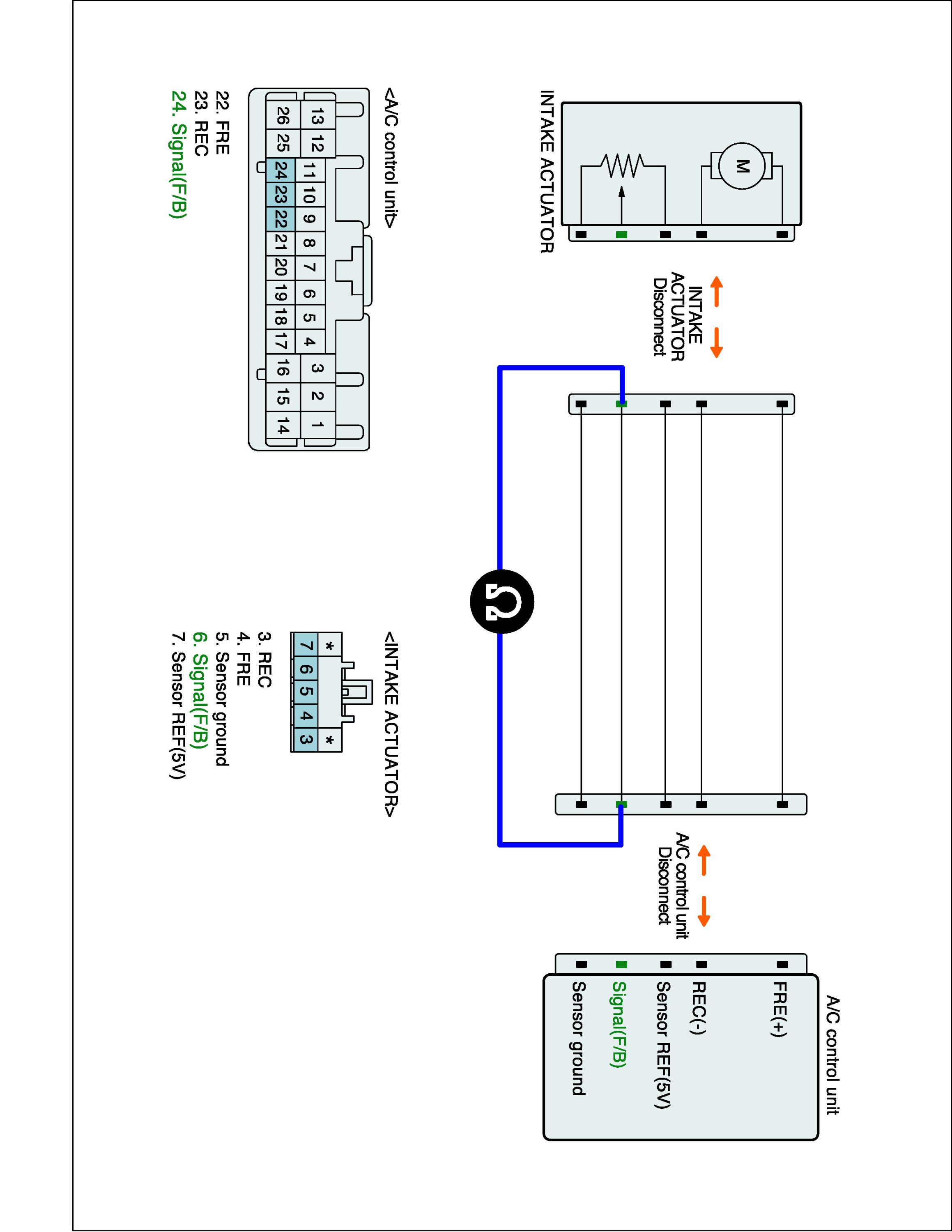 3. Measure resistance between Signal (F/B) terminal of Intake actuator harness connector and Signal (F/B) terminal of A/C-ECU harness connector.