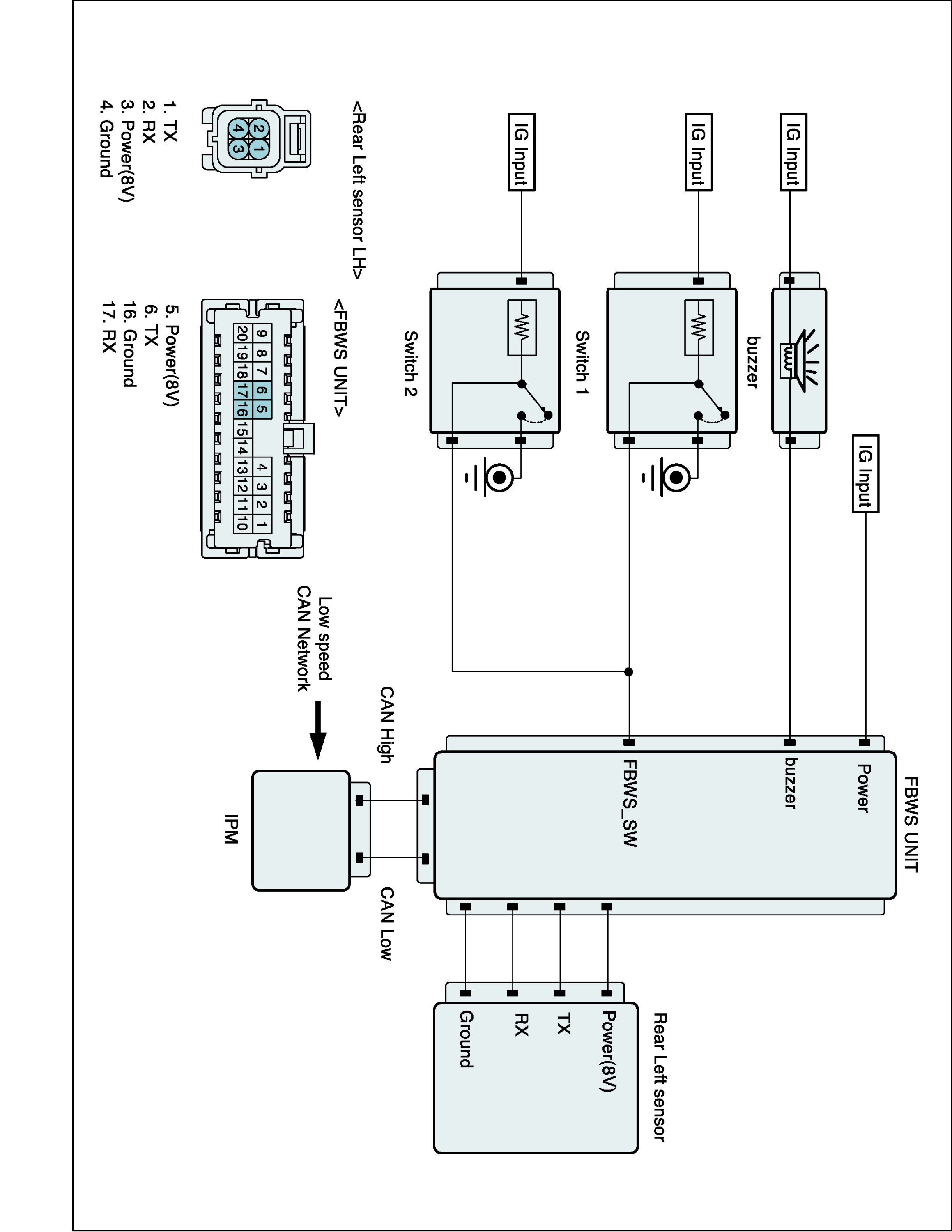 FBWS is a parking assistant system. It has a supersonic sensor which radiates supersonic to front and rear side of the vehicle to detect supersonic reflected from an obstacle. It calculates distances between vehicle and obstacle if it detects reflected supersonic. It warns being obstacle to drivers through buzzer or displaying on cluster according to distance from obstacle. Warning level is divided into 3 step (warning level rises progressively according to distance from obstacle)