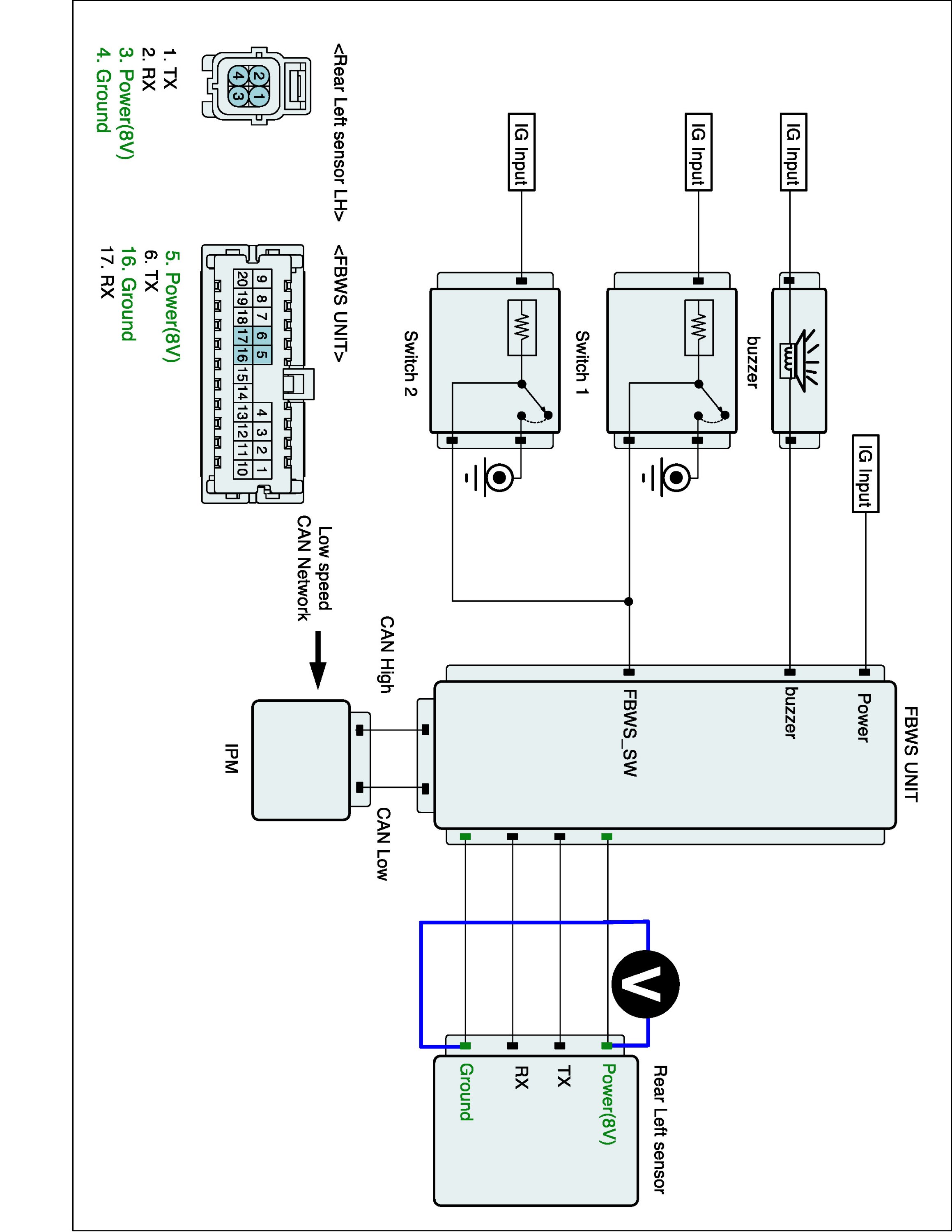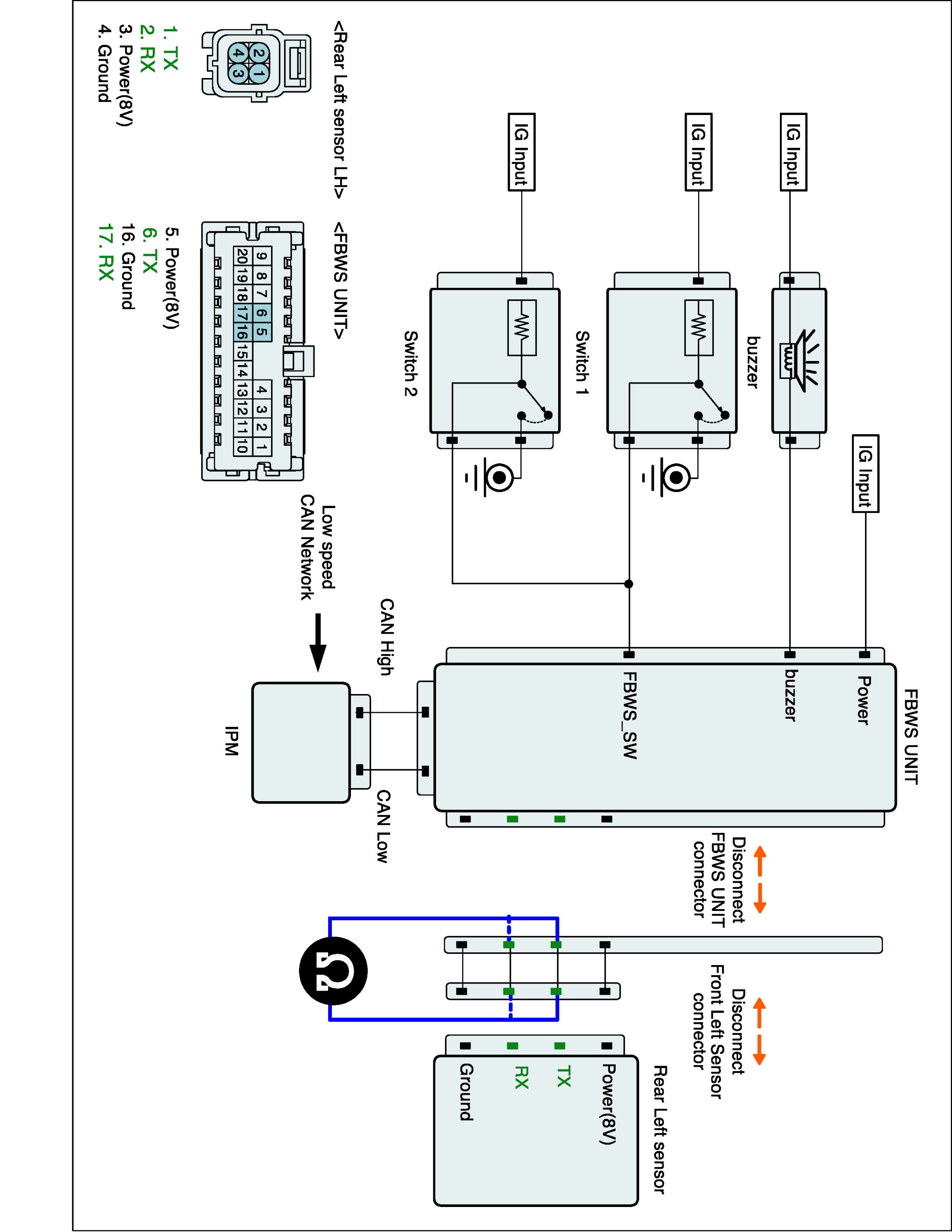 3. Measure resistance of TX, RX line between FBWS unit and rear left sensor harness connector.