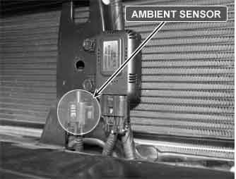The ambient temperature sensor located at the center stay of the condenser detects ambient air temperature. It is a negative type thermistor whose resistance is inversely proportional to temperature. Its output is used for sensor fail-safe, temperature regulation door lock, blower motor level control, mix mode control and in-car humidity control.