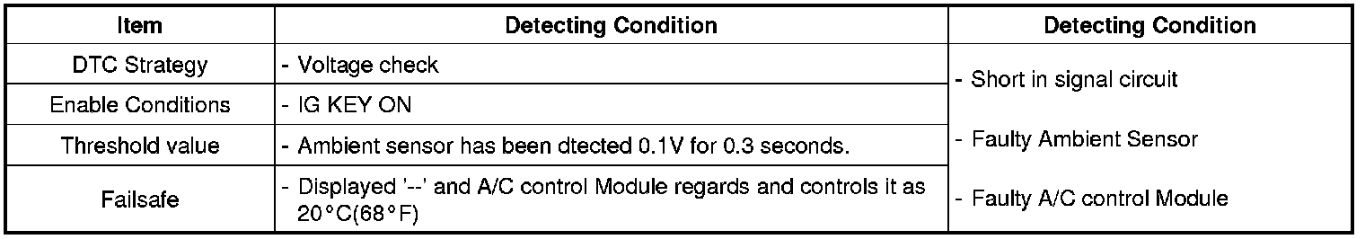 Air conditioner Control Module sets DTC B1237 if Ambient sensor has been detected below 0.1 V for 0.3 seconds.